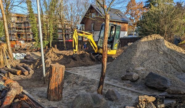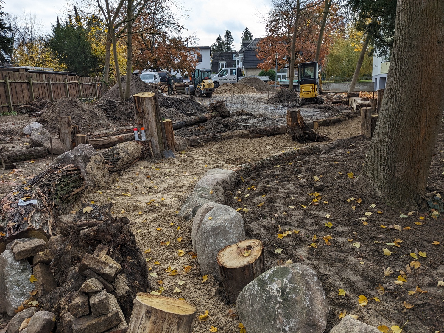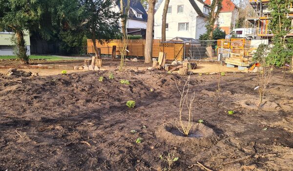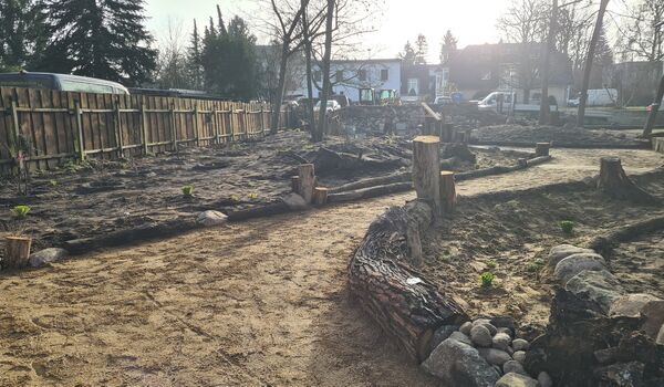 Der erste PikoPark für die Märkische Baugenossenschaft ist durch einen Hügel vom Parkplatz abgegrenzt. Inmitten von Bestandsbäumen finden sich in Frohnau nun Wald-, Sand- und Schotterbeete und ein Kräuterrasen.