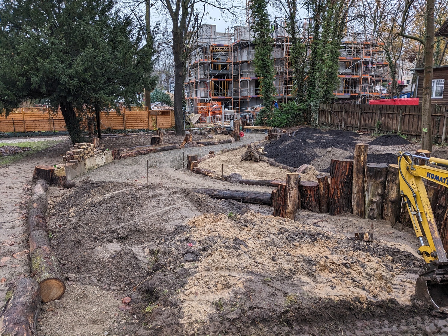 Sandmagerbeete, Lehmlinse für Staunässe, stehendes und liegendes Totholz, Balancierparcour, große Findlinge, Wildbienennisthilfe