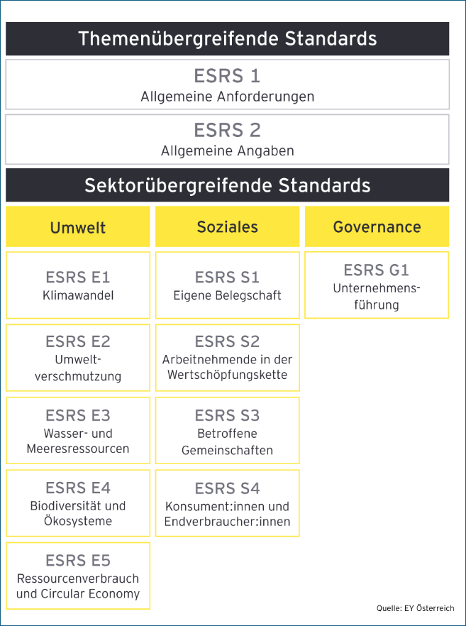 Im Umweltbereich gibt es fünf spezifische Standards: Klimaschutz und Energie (E1), Umweltverschmutzung (E2), Wasser und Meeresressourcen (E3), Biodiversität und Ökosysteme (E4) sowie Ressourcennutzung und Kreislaufwirtschaft (E5). Unternehmen müssen relevante Themen berichten, können jedoch nicht wesentliche Aspekte auslassen.
