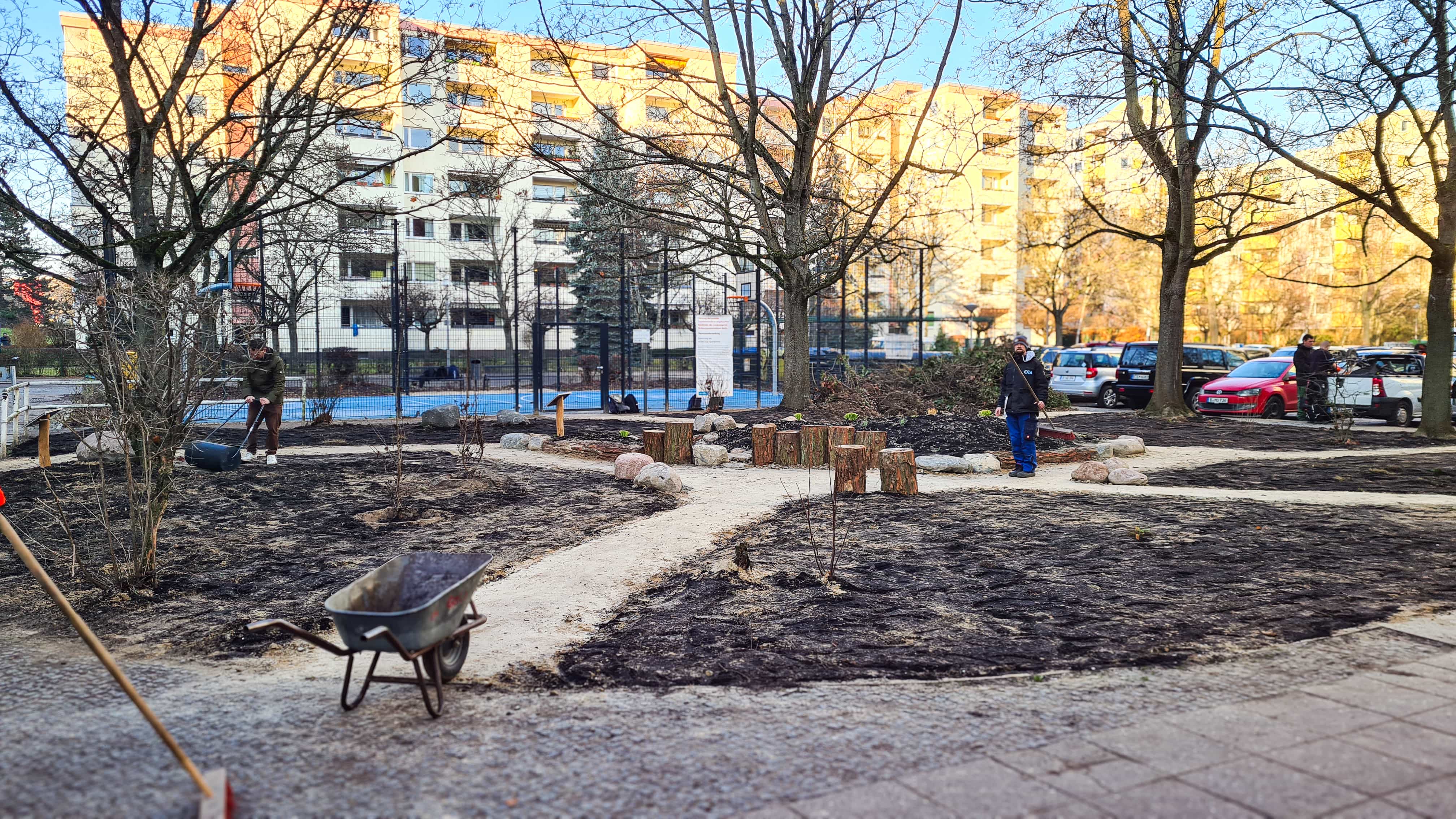 Ende Dezember stellten wir ein Trittsteinbiotop in der Thermometersiedlung fertig. Umgesetzt wurde die Fläche als Praxisbaustelle gemeinsam mit Azubis des Ausbildungszentrums OTA gGmbH. Die Fläche ist im Bestand der HOWOGE und umfasst etwa 30 m² Trittsteinbiotop, ergänzt durch rund 300 m² Blumenwiese. Die Bauzeit erstreckte sich von November bis Dezember 2025.