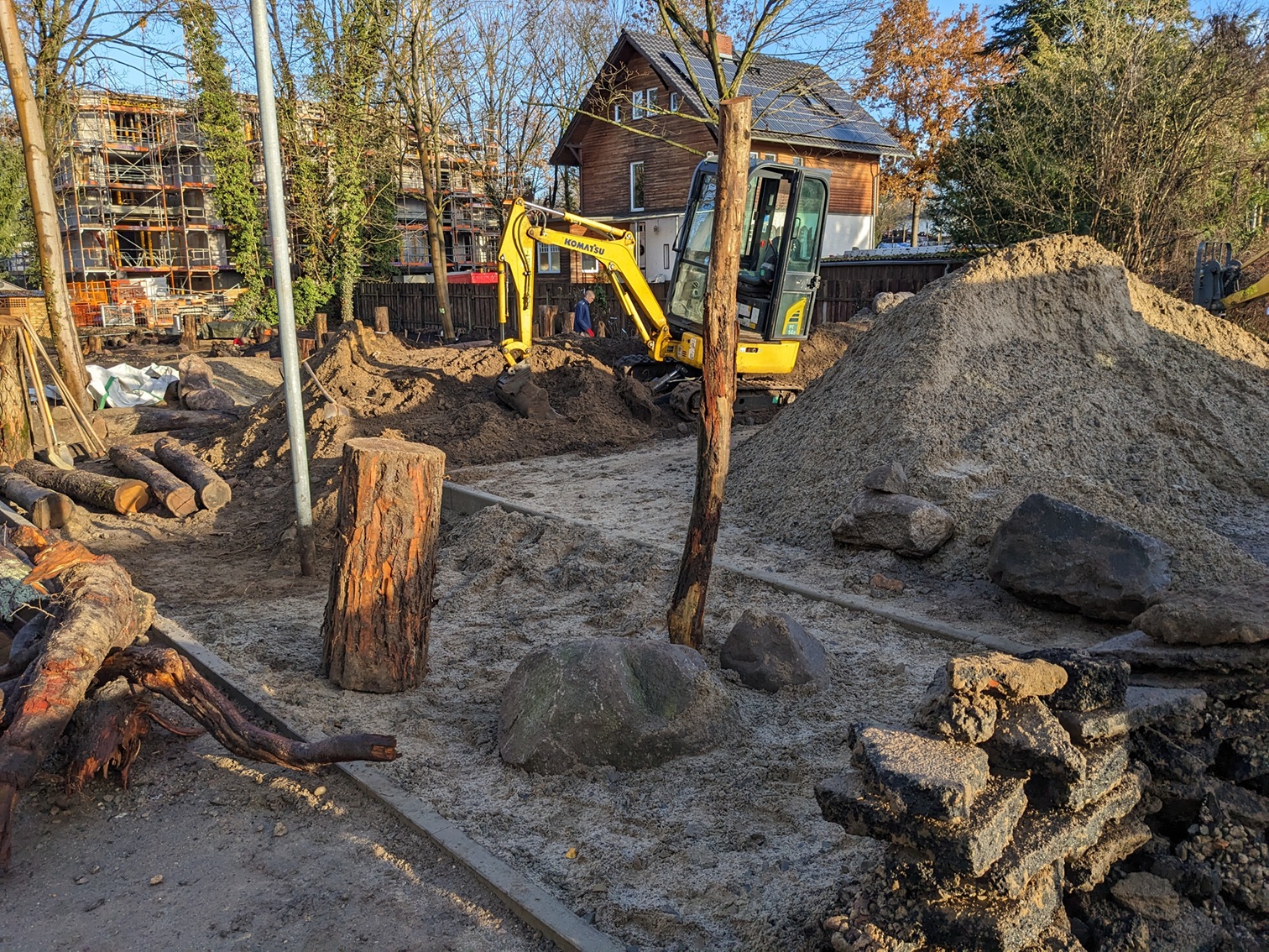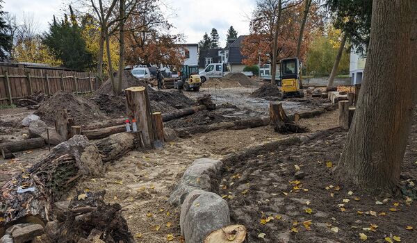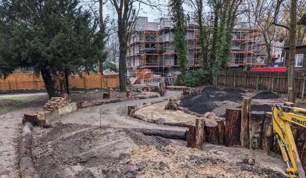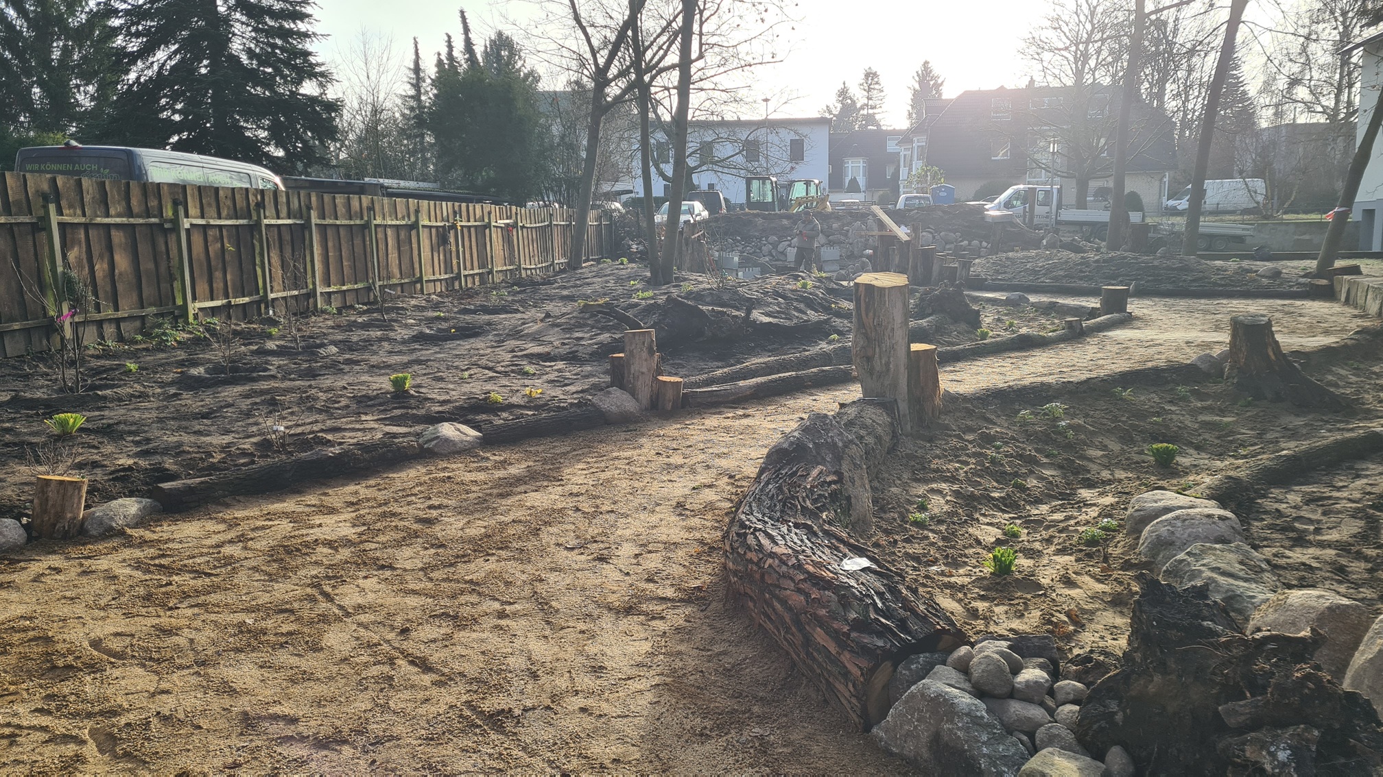 Der erste PikoPark für die Märkische Baugenossenschaft ist durch einen Hügel vom Parkplatz abgegrenzt. Inmitten von Bestandsbäumen finden sich in Frohnau nun Wald-, Sand- und Schotterbeete und ein Kräuterrasen.