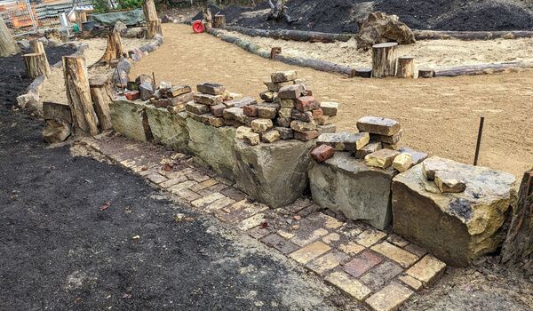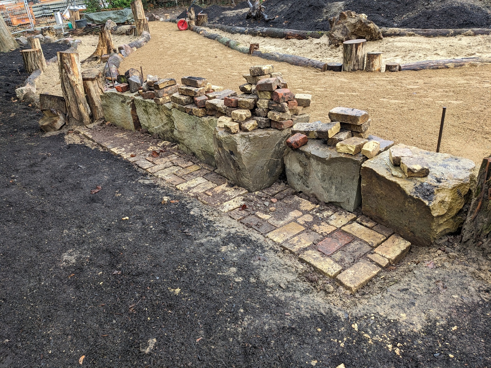 40 Meter Trockenmauer aus Sandsteinen, Magerbeete, stehenden und liegendes Totholz, Lesesteinhaufen, Sandarium, Wildbienennisthilfe, Laub-Reisig-Habitat