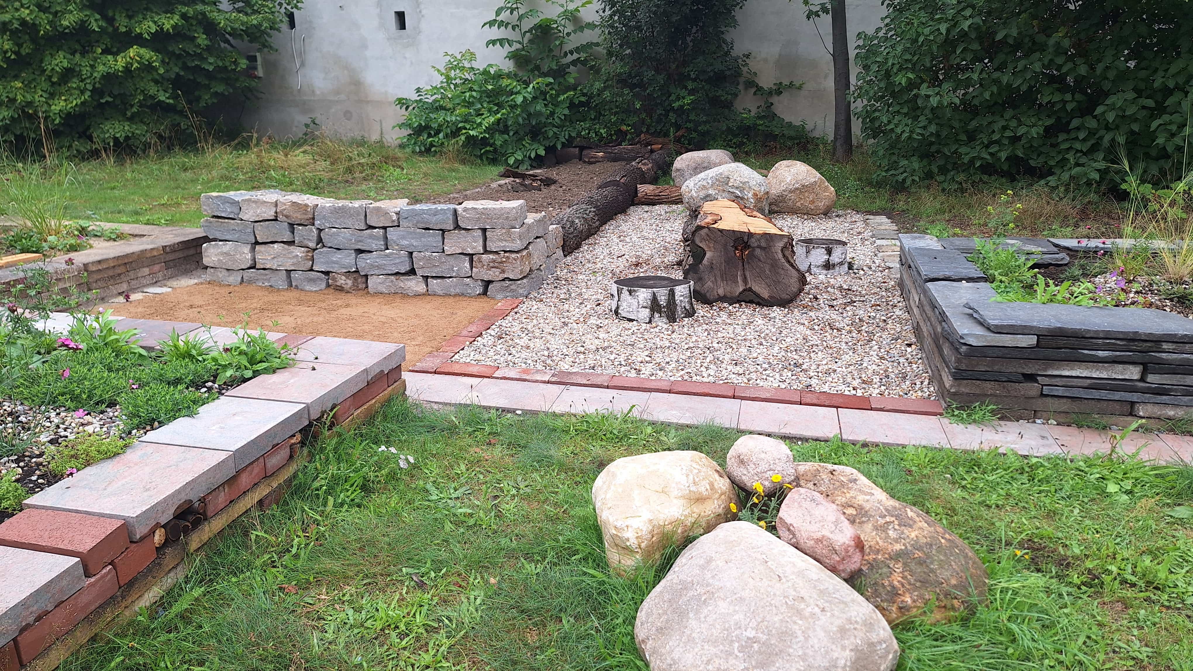 schattiger Standort, Entsiegelung der wohnungsnahen Freifläche, Nutzung von alten Pflastersteinen als Strukturelemente in Trittsteinbiotop